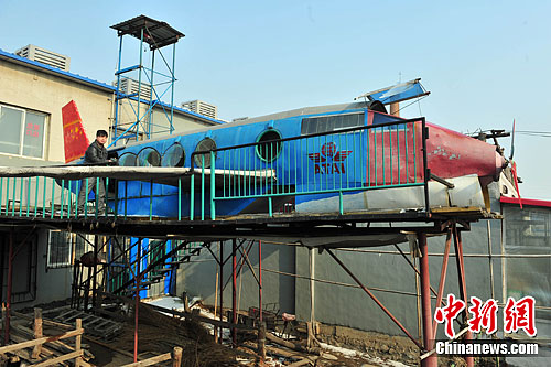 2月28日,沈阳农民李晶纯在自家院中制造“大型客机”。目前,辽宁沈阳市长白乡58岁农民李晶纯用时2年制作的“大型客机”已初见雏形,进入内饰安装阶段。据李晶纯介绍,制作这架“大型客机”是为了圆其儿时成为一名飞行员的梦想。制作飞机的材料多数是买来的废弃钢材,由他自己焊接而成。机身长约5米,机翼宽约4米,重达1吨,总共花费约4万余元。