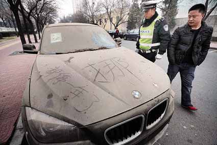 昨晚,记者在中央电视台西门外的柳林馆路自行车道上,找到了这辆宝马。只见车身上下蒙着约1厘米厚的尘土,雨刷器的缝隙中落满了枯枝,引擎盖上还有点点鸟粪。