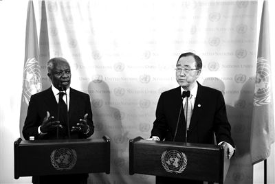 2月29日,联合国秘书长潘基文(右)和叙利亚危机联合国与阿盟联合特使安南共同会见媒体。 新华社发