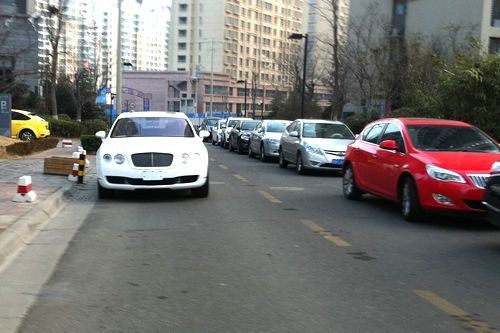 崂山某小区拥有40多个楼座,早高峰车流量非常大,小区内实行单向行车,路东边为停车位,路西为行车道。8点30分许,正是车流量较大的时候,一辆没有挂牌的白色宾利轿车大方地停在了行车道上,由于车体宽大(宽度达到了1.9米),给其他车辆留下的通行空间非常有限。