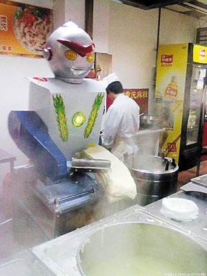 天津北方网讯:机器人不搞科研专门做刀削面,天津科大泰达校区的食堂里玩起了“高科技”,这个憨态可掬的机器人大厨已经成为校园里人气较旺的明星,被学生们亲切地称为“奥特曼”。