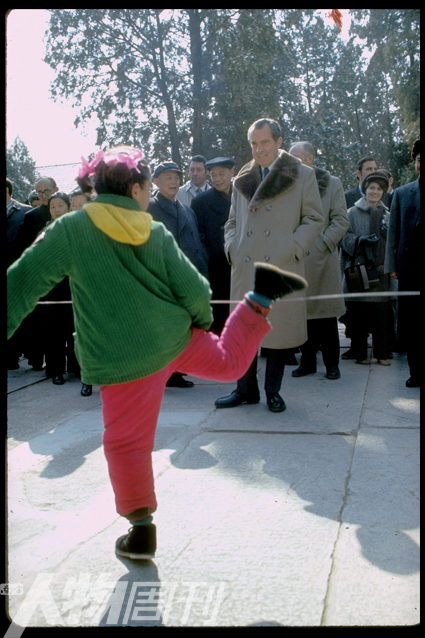 1972年2月24日,北京,尼克松观看小女孩玩跳橡皮筋游戏