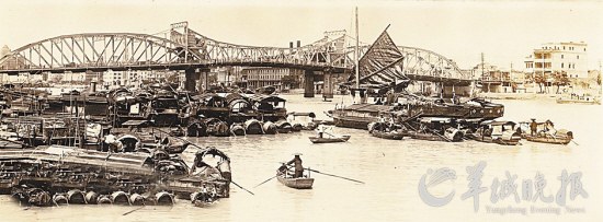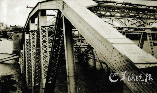 81938年10月,日寇要入侵这座较大的城市,中国军队奉命炸毁这道桥。可是炸药不够,只炸坏了一点,从此,海珠桥也沦入魔掌之中。开合机器整套被日本人用船运回国去了。