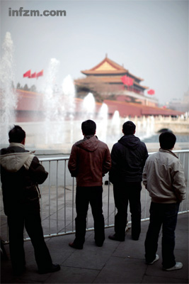 两会期间,几名游客隔着栏杆,凝望远处的天安门。(南方周末记者 王轶庶/图)