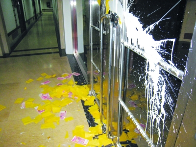 记者随后赶到位于玄武门附近的南京市规划建设展览馆地下一层,看到一家店家门面玻璃上被泼了不少白漆,还贴了不少百元冥币。据负责规划展览馆的新鸿运物业管理丁主任称,他们是一早巡查时发现的,也不知道是谁弄的,估计是在夜间所为,并称事发地点有监控,民警正在调看处理。而展览馆物业部值班的负责人杨先生则表示,这家店铺租用这里有不少年了,与展馆物业方面也没有什么过节,应该是这家公司自身惹来的纠纷,但不管怎么样,如此恶作剧太不应该。