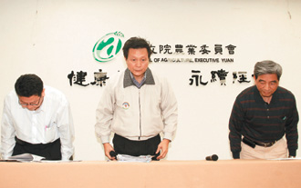 “农委会副主委”王正腾(中)、“防检局”主秘张世扬(右)、动检防疫组组长傅学理(左)等人,昨说明H5N2禽流感处理过程,对引发恐慌道歉。