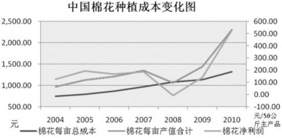 近年来,由于物价上涨,棉花的种植成本也有所上涨。2010年棉花价格较高,种植面积有所上升,不过植棉成本也迅速攀升。2011年棉花产值为1995.1元/亩,其中总成本1584元/亩,净利润411元/亩。总成本中每亩物质与服务费用585元,同比上涨39%,人工成本782元,同比上涨9%,土地成本217元,同比上涨24%。物化成本中,种子50元,化肥165元,农药、农膜和农家肥200元,机械租赁150元,其他20元,均出现了不同程度的涨幅。棉花每隔15天就要修整一次,还要定期浇水,及时通风,且采摘期较长,棉农如果种植棉花,就无法外出打工。与此同时,国家政策对粮食种植补贴明显多于棉花。目前,农民种粮有良种补贴、种粮补贴、农资综合补贴,2011年每亩共计补贴98元。而政府对种棉补贴较少,仅有每亩15元的良种补贴,农民植棉意愿明显不如种植粮食作物。