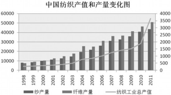 入世10年来,我国的纺织产业保持了高速发展的状态。2011年,规模以上纺织企业累计实现工业总产值54786.5亿元,同比增长26.8%。纺织行业总量继续保持增长,但增速明显回落,固定资产投资和新增项目增长缓慢,行业利润增长持续回落,主要原因是劳动力成本上升、原材料涨价、人民币升值。纺织产业的高成本时代已经到来,以廉价劳动力作为主要支撑的中国纺织服装业已逐渐丧失了成本优势。