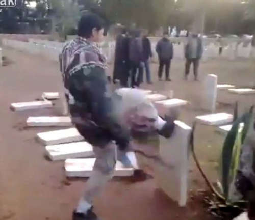 日前在网络上流传的一段视频显示,设在利比亚班加西市的一个大型英国士兵墓群遭到利比亚一个团伙袭击,该团伙用暴力方式将墓碑砸毁,同时他们的口中还夹杂着脏话。